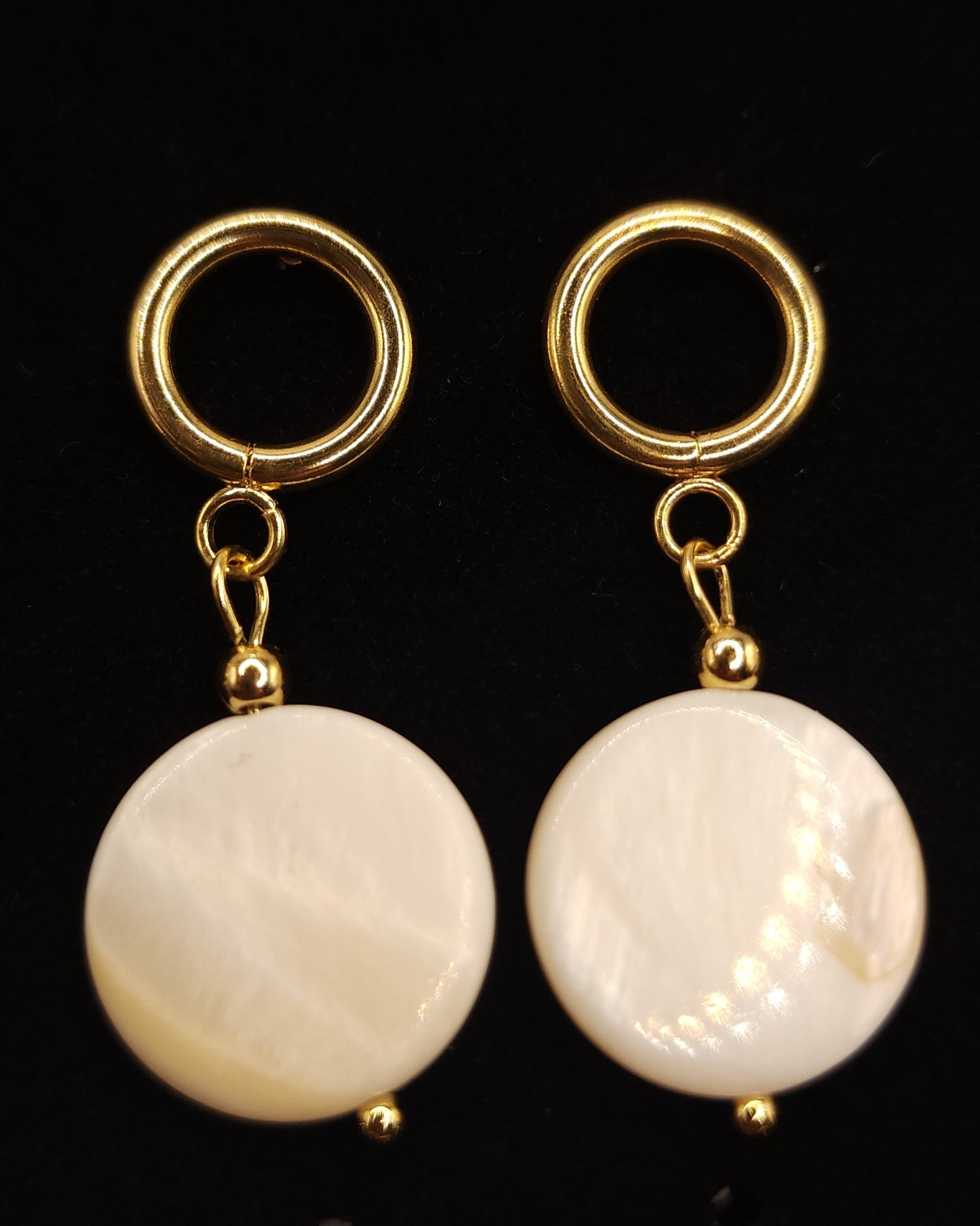 Nacar/mother pearl flower and round earing, with 18k gold plated chain. Earing post material is stainless steel.
