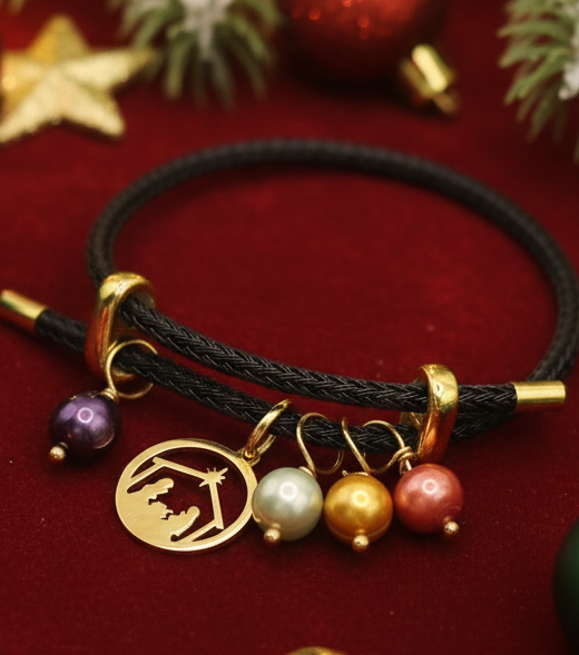 Purple for advent. The Nativity scene Gold plated 18k. The 3 fresh water pearls represent the 3 Kings that will visit baby Jesus.